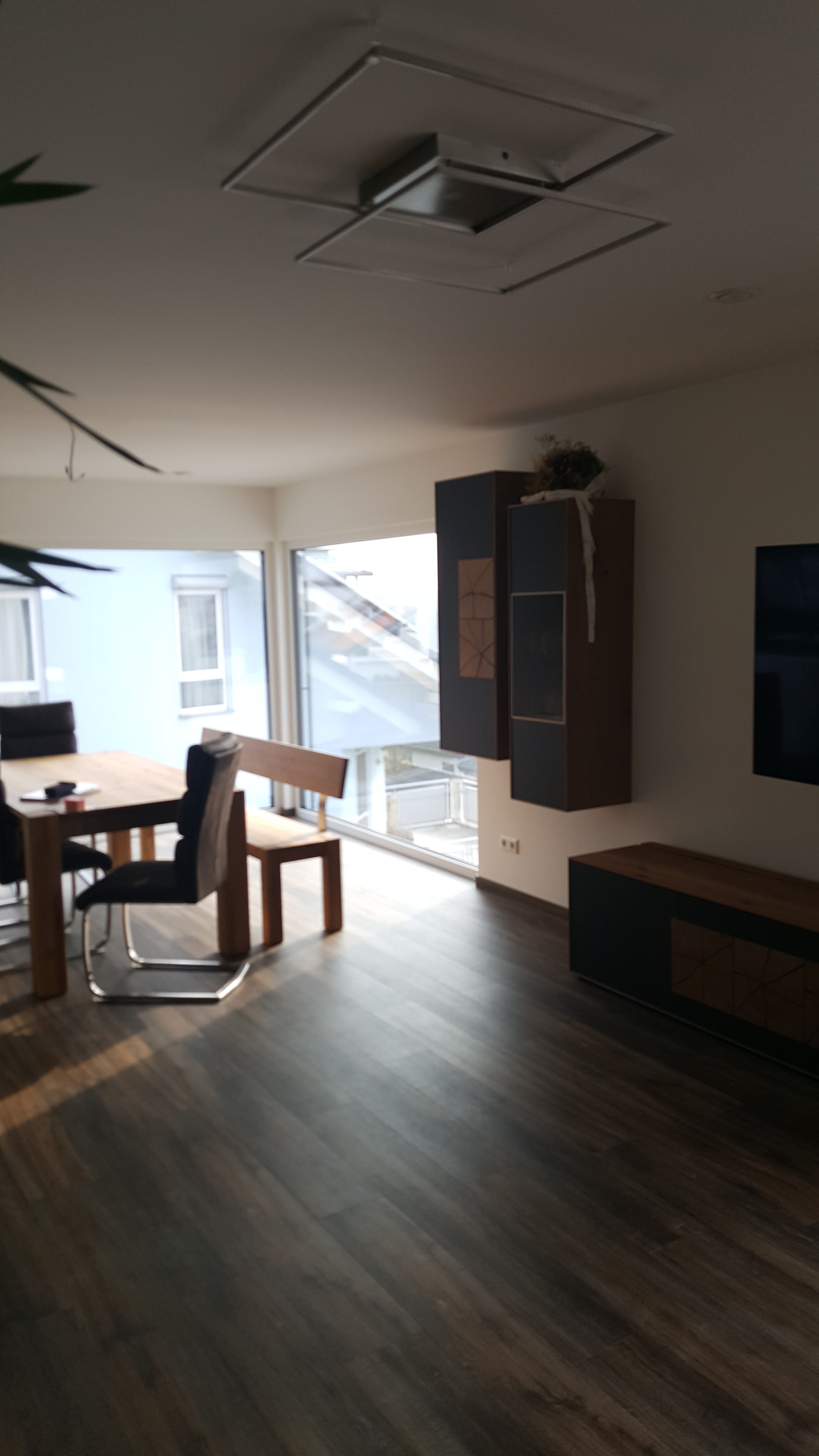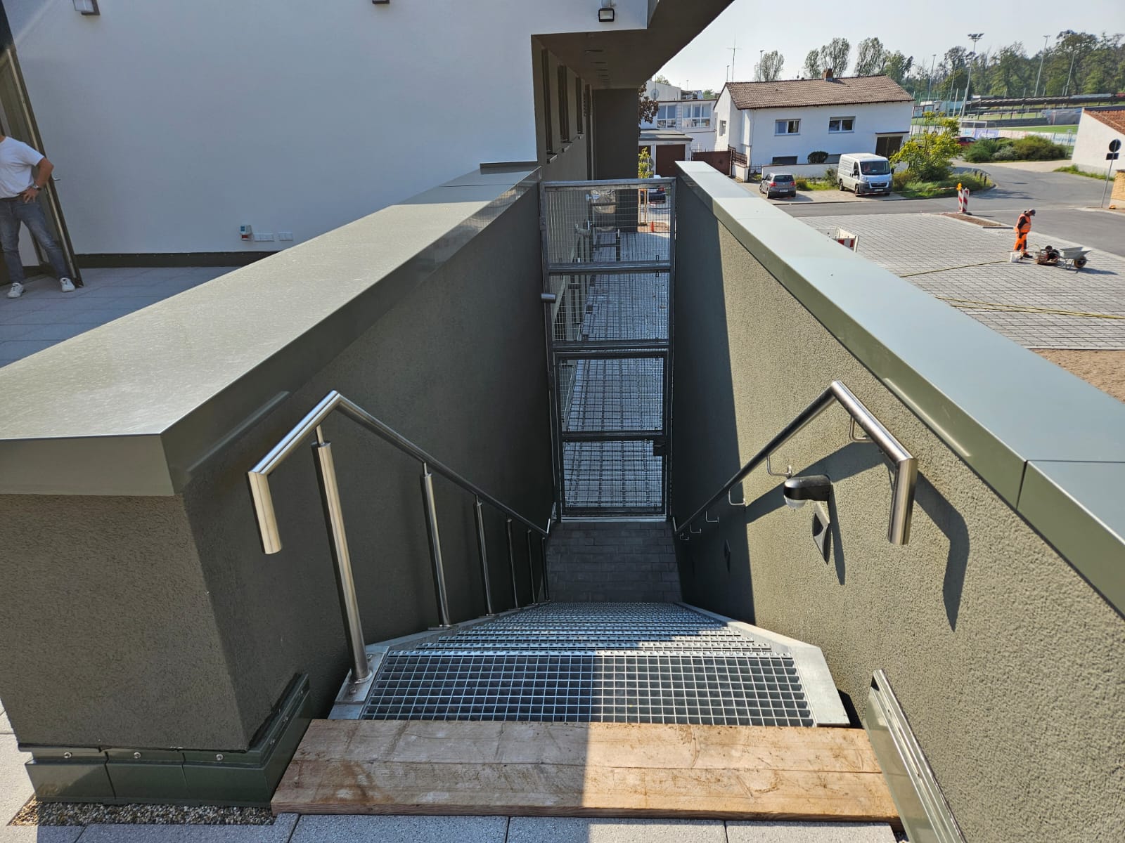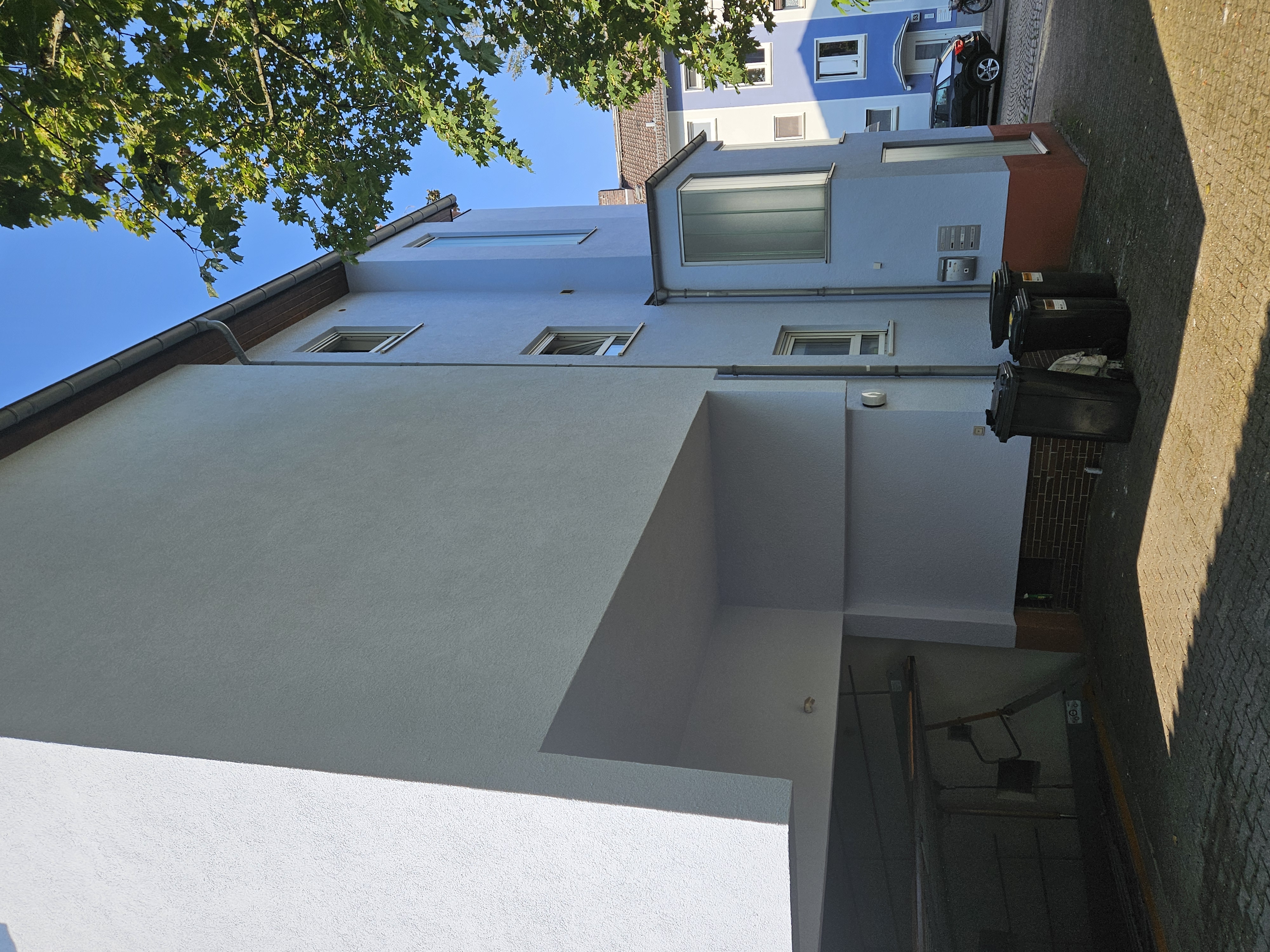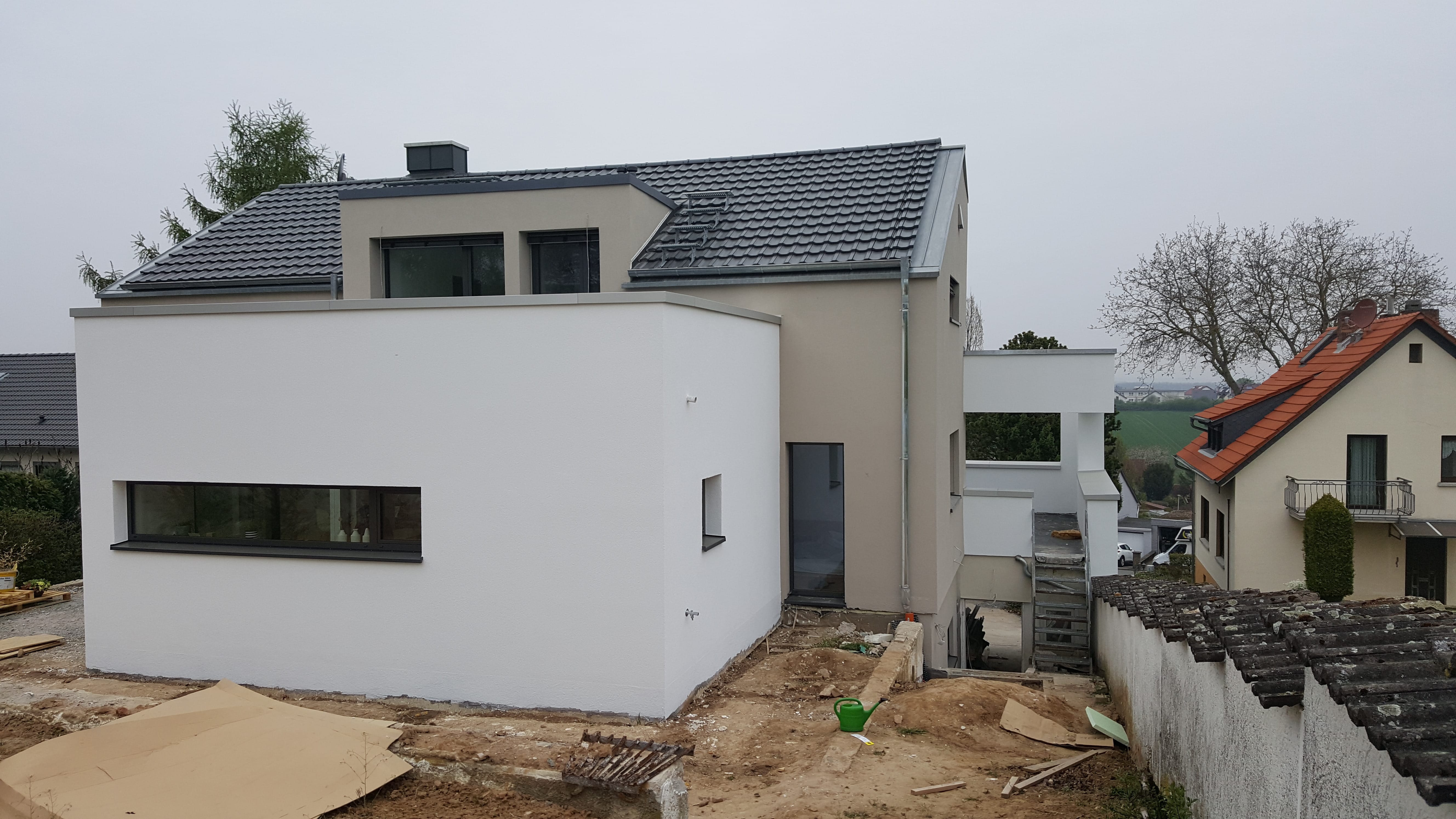 Neubau MFH Die Aussenhaut wurde mit 16 cm Dämmung verkleidet und mit einem 3 mm Kratzputz verputzt .Der Sockel wurde mit einer Besenzutechnik bearbeitet.Ausführung 2018.